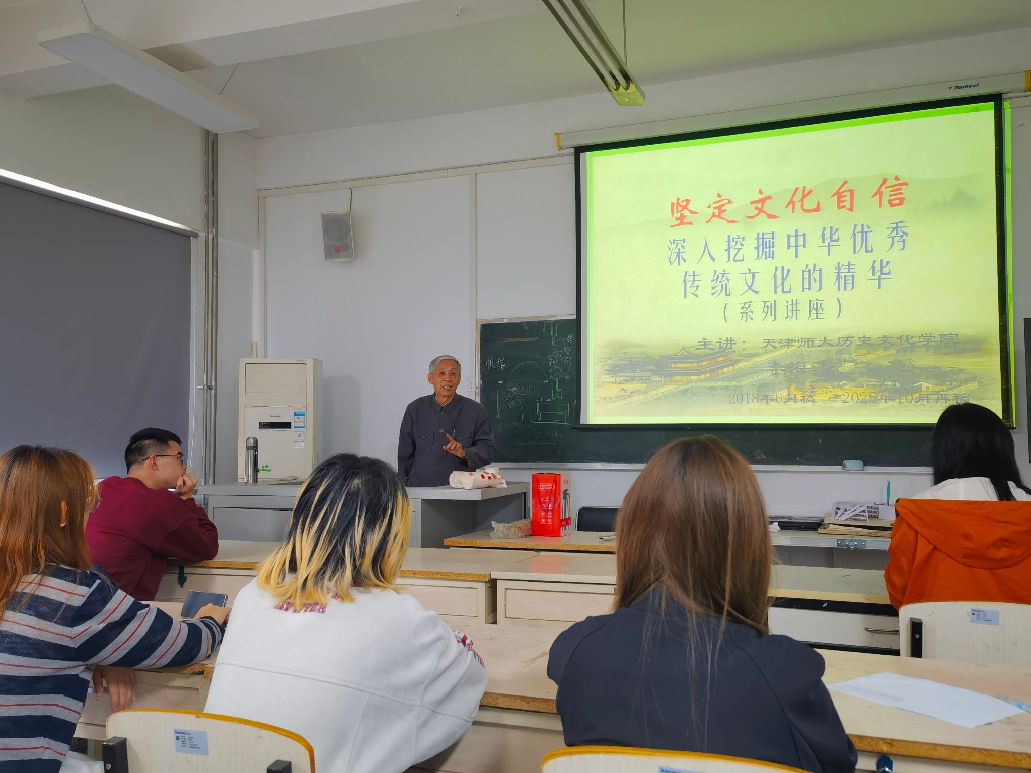 2025年10月14日,天津师大关工委报告团成员、历史文化学院退休教授李海涛应校关工委邀请,在志成路校区为我校环境学院学生作题为《坚定文化自信——深入挖掘中华优秀传统文化的精华》的专题讲述。78岁的李海涛教授精神矍铄,以“长江黄河”比喻中华文明绵延不绝的历史进程,阐释中华文化的多元共生与融合性。他结合环境学院专业特色和需求,深入解读“天人合一”“和而不同”等传统理念与现代生态文明建设的高度契合,现场展示清代青花盘、祺祥通宝等珍贵文物,引导同学们从传统文化中汲取绿色发展的智慧。整场讲座气氛热烈,掌声不断。同学们纷纷表示,将以李教授为榜样,坚定文化自信,把中华优秀传统文化转化为建设美丽中国的青春力量。